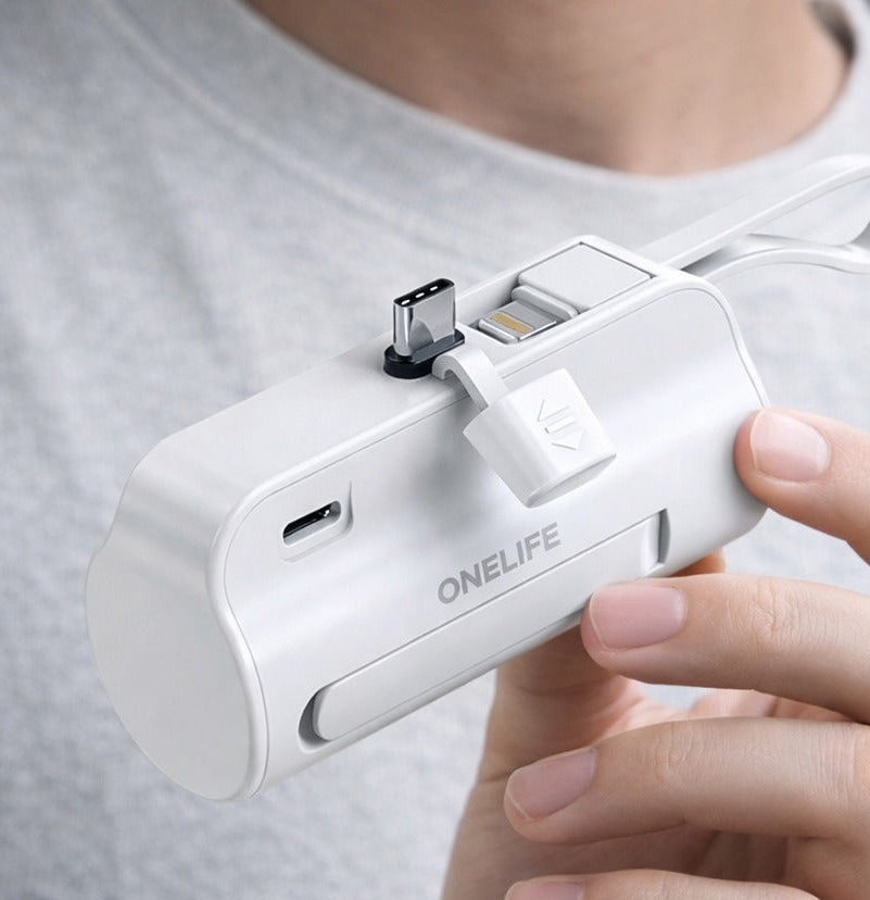 White Onelife 5000mAh Power Bank | 15W Fast Charging | Built-in Cable | USB-C | Compact & Portable